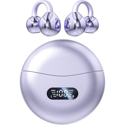 Open Wireless Bluetooth 5.4 Clip-On Earbuds with C-Shaped Bridge, Slim Hook, 60-Hour Battery Life, Waterproof, for Glasses Wearers and Athletes (Purple)